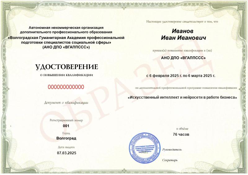 Повысить квалификацию – значит получить новые навыки и компетенции. Курс завершается выдачей официального удостоверения, где указывается ФИО выпускника, название программы, сроки обучения и продолжительность программы.